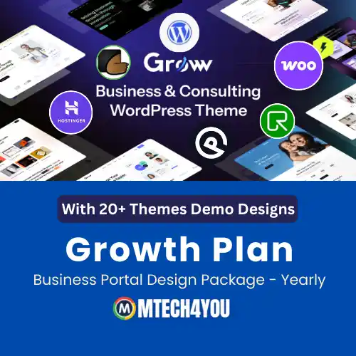 Growth Plan – Yearly Small Business Design Package with free .in domain & SSL, SEO-ready responsive design, 5 business emails, up to 10 dynamic pages, no auto-renewal, and priority technical support.
